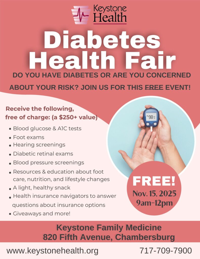 The 2024 Keystone Health Diabetes Health Fair will take place on November 15, 2025 from 9 am- noon, and will be held at 820 Fifth Avenue, Chambersburg (Keystone Family Medicine). No registration is required, just walk-in!